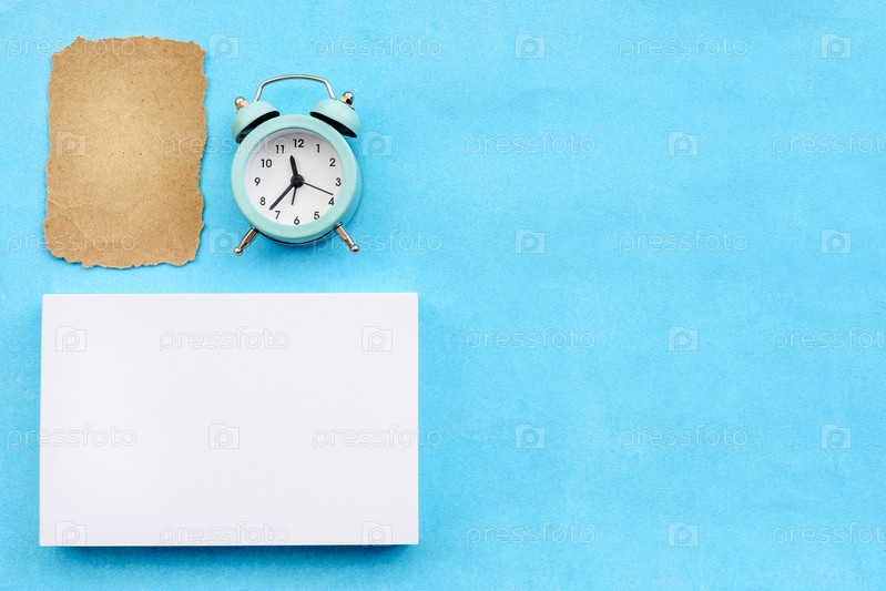 Макет канцелярских товаров на синем фоне, стопка белых карточек, будильник и порванный кусок крафт-бумаги