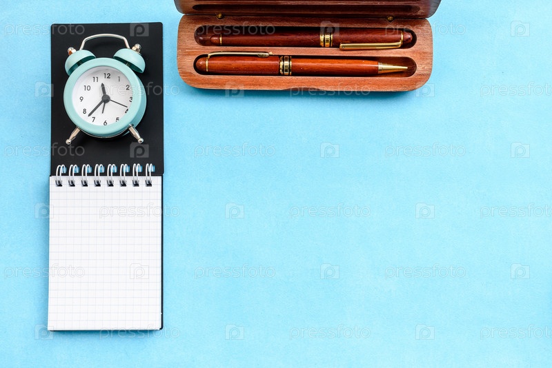 Макет канцелярских товаров на синем фоне - блокнот на пружине, парковочные места и винтажный будильник