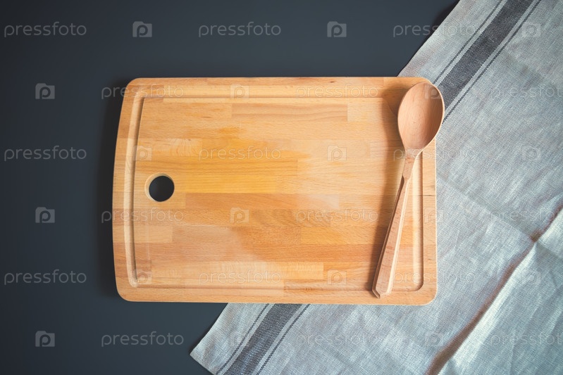 Деревянная разделочная доска с деревянной ложкой на темном фоне