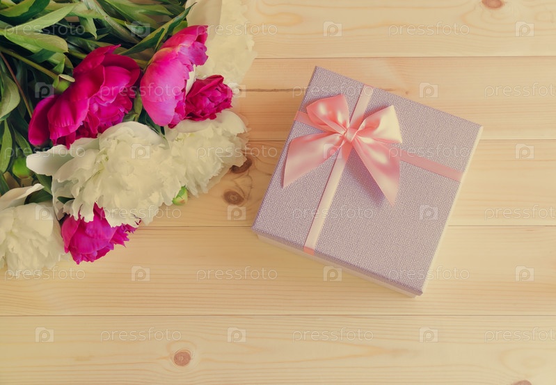 Красные и белые цветы пиона и подарочная коробка на деревянном фоне