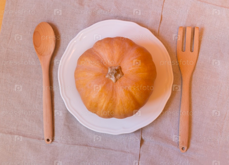 Оранжевая тыква на белой тарелке с деревянной вилкой и ложкой рядом. Приготовление овощей