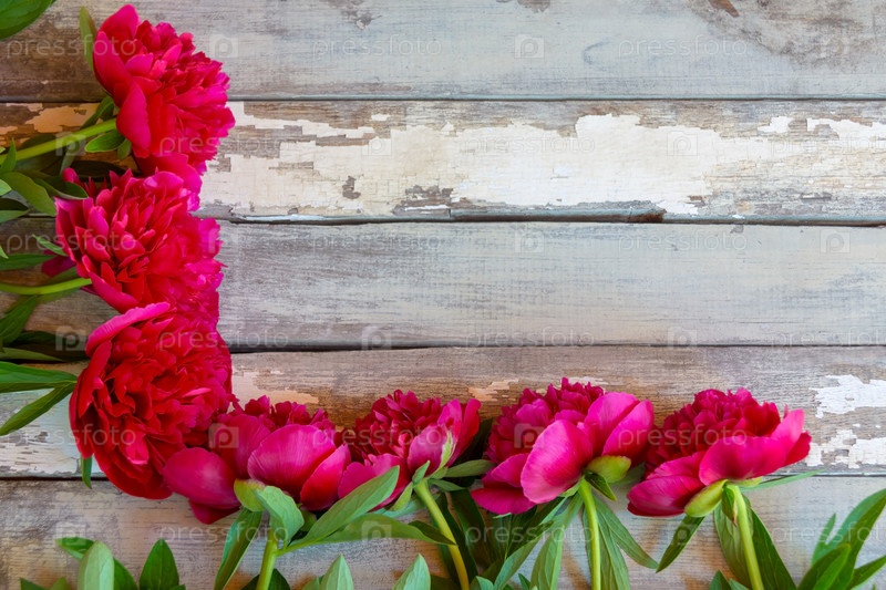 Красные цветы пионов граничат на старом деревянном фоне. Селективный фокус. Место для текста