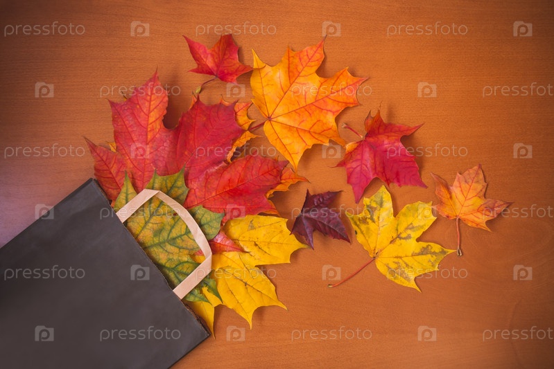 Красочные осенние листья в коричневом бумажном пакете. Концепция продажи и покупок