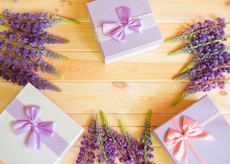 Рамка из синего люпина полевых цветов и подарочных коробок на деревянном фоне. Вид сверху, пространство для копирования