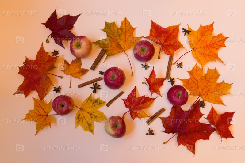 Красочный осенний узор из яблок, специй и листьев. Концепция осени