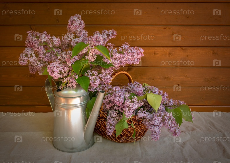 Лейка и корзина с ветвями цветка сирени