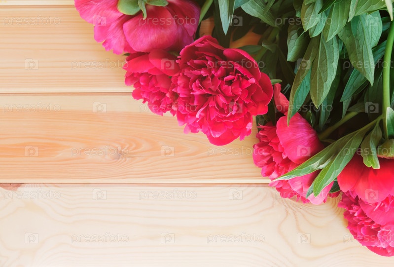 Красные пионы на деревянных фоне. Плоская планировка. Место для текста