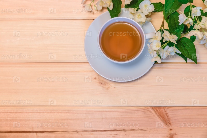 Зеленый чай и цветы жасмина на деревянном фоне. Вид сверху, пространство для копирования