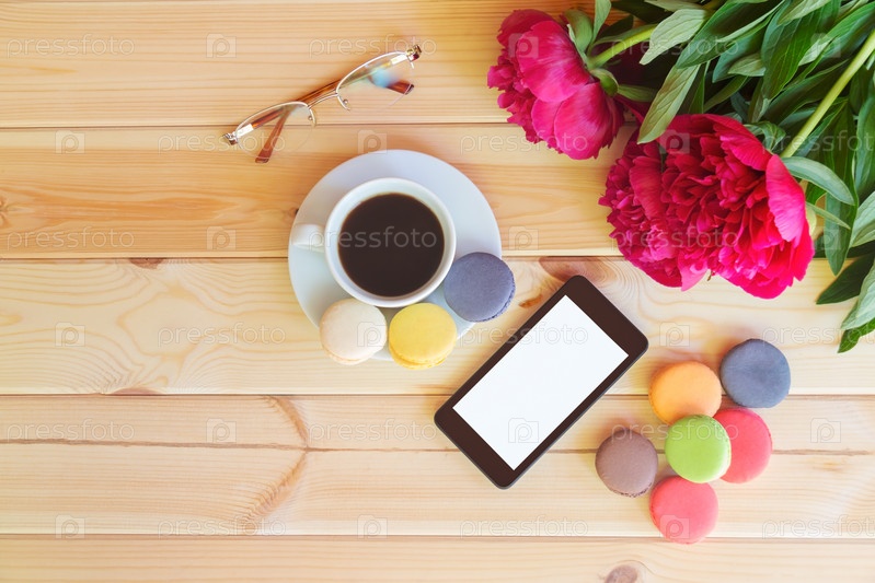 Кофейная чашка, смартфон, очки и красные цветы пиона на деревянном фоне. Вид сверху, пространство для копирования