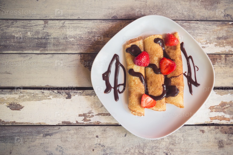 Блинчики со свежей клубникой и шоколадным сиропом на старом деревянном фоне. Вид сверху