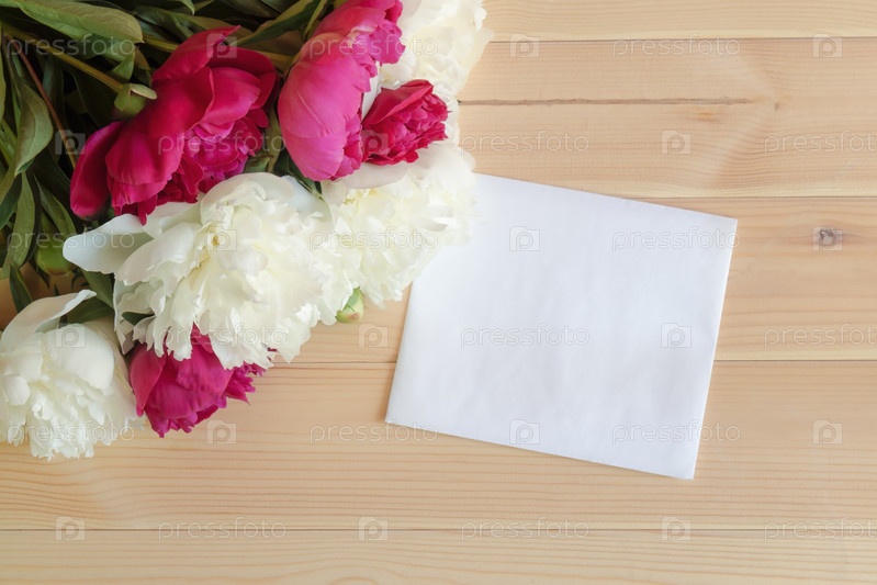 Красные и белые цветы пиона и пустая карточка для текста на деревянном фоне