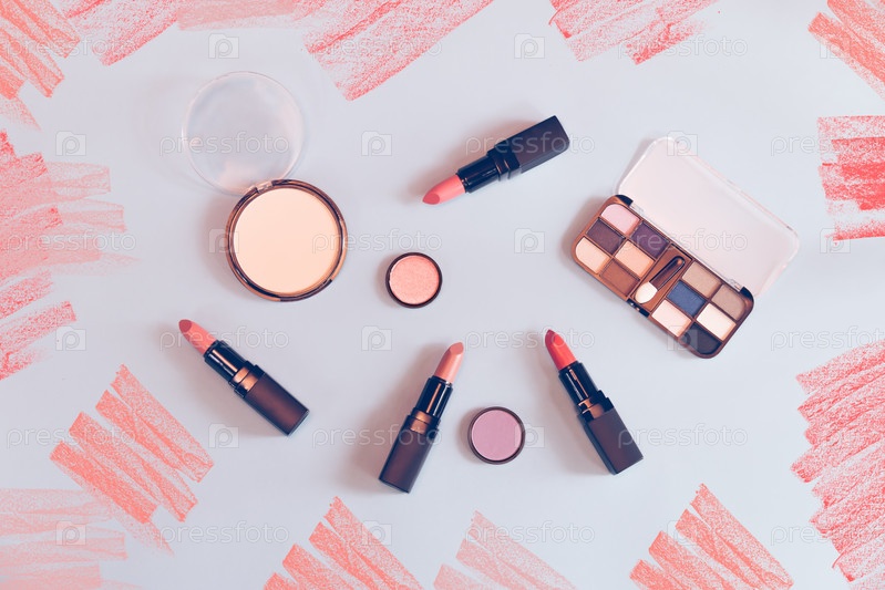 Косметика для макияжа на синем фоне