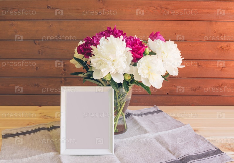 Красные и белые пионы в вазе и белой рамке на деревянном фоне