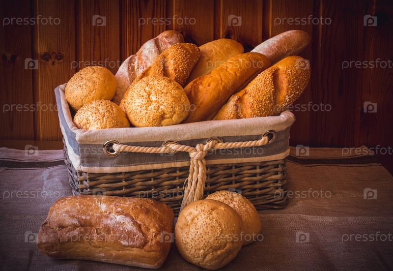 Свежий пшеничный хлеб в плетеной корзине и рядом на деревянном столе
