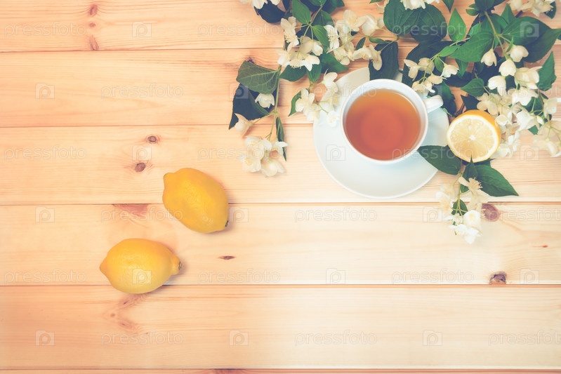 Цветы зеленого чая, лимона и жасмина на деревянном фоне. Вид сверху, пространство для копирования. Тонированное изображение