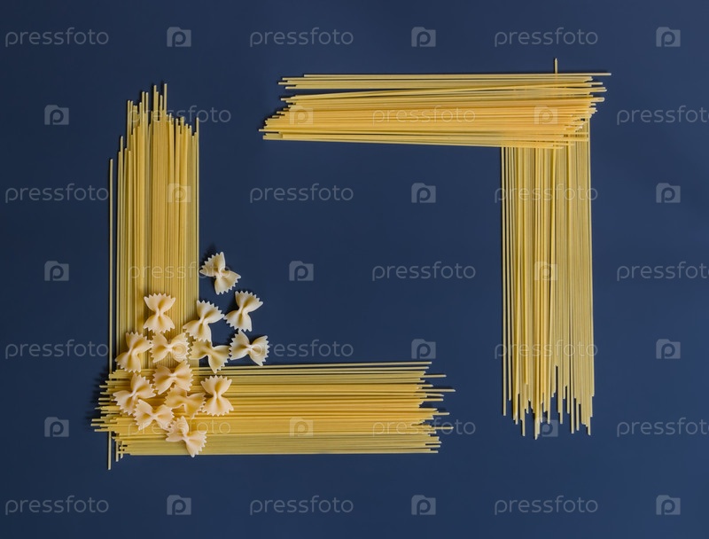 Сырые макароны, спагетти и фарфалле в форме рамки на темном фоне