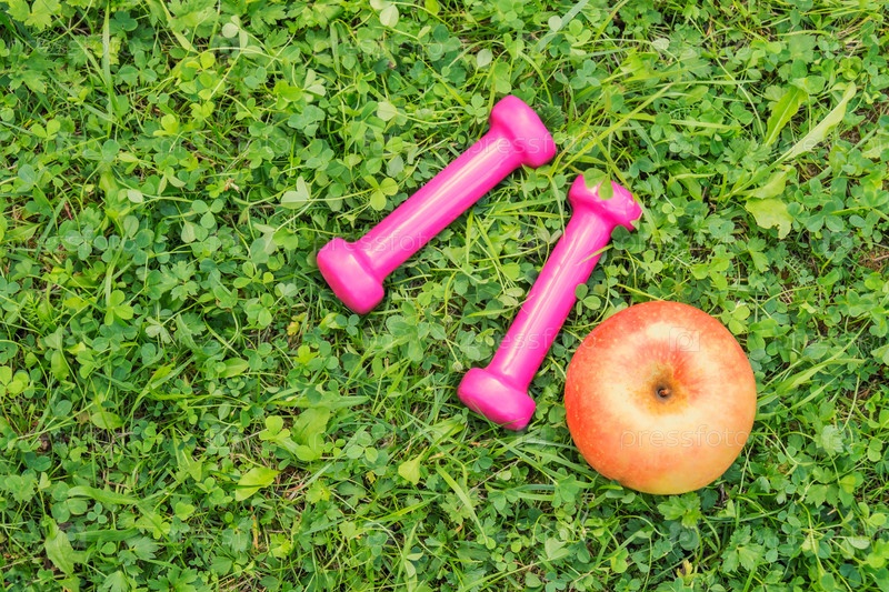 Две розовые гантели и яблоко на зеленой траве. Вид сверху, пространство для копирования