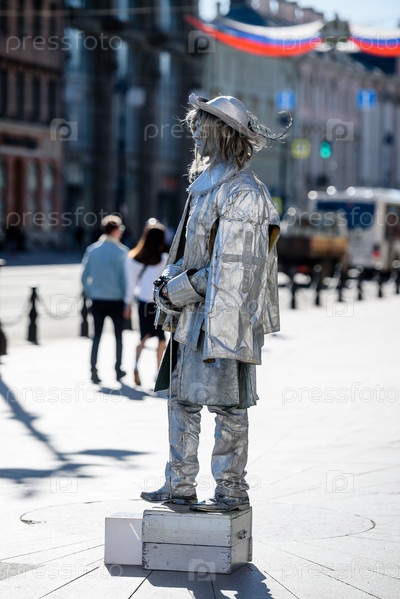 Россия, Санкт-Петербург, 23 мая 2020 года: художник-человек изображает памятник на улице
