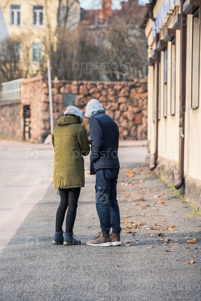 Россия, Выборг, 06.11.2019: парень и девушка гуляют по улицам древнего города Выборг