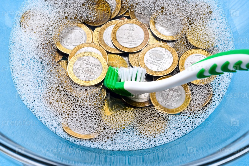 Отмывание денег. Монеты моют в мыльной воде. Налоги и финансы
