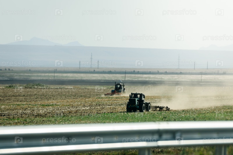 Россия, Крым, 11 сентября 2019 г.: трактор пашет поле. Степи в Крыму. Пейзаж летнего Крыма