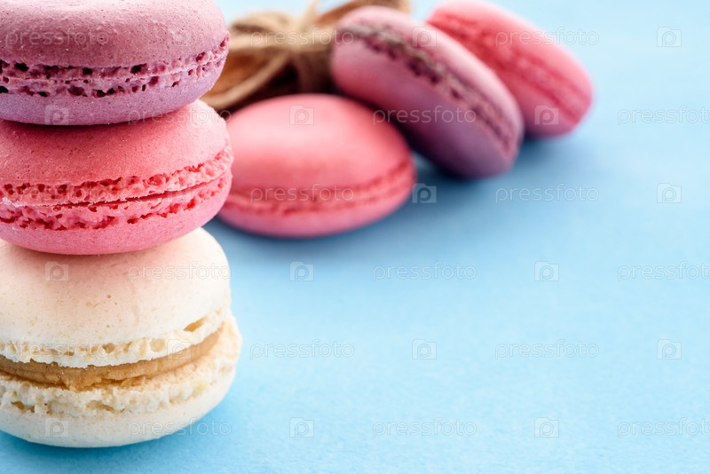 Французские макароны на синем фоне. Модный десерт. Сладкие пирожные