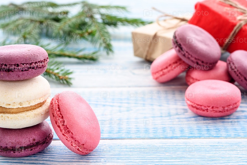 Сладкие макароны на синем фоне. Модные торты