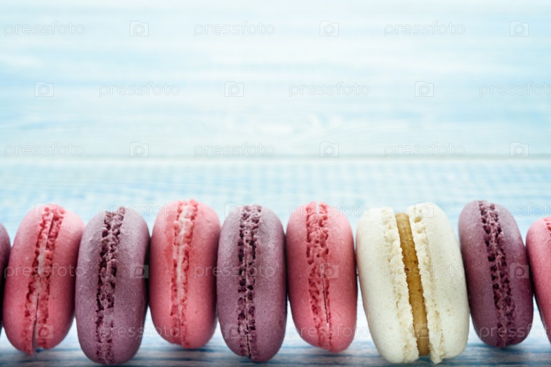 Сладкие макароны на синем фоне. Модные торты