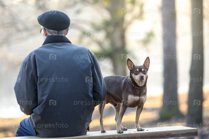 Собака с хозяином на скамейке, вид сзади
