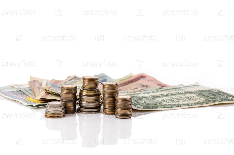 Денежные монеты и купюры на белом фоне. Финансовые пирамиды и инвестиции
