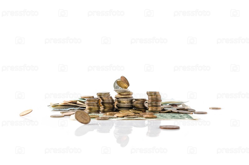 Денежные монеты и купюры на белом фоне. Финансовые пирамиды и инвестиции