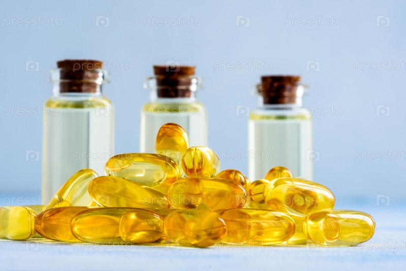 Здоровье, витамины и натуральные лекарства - капсулы омега-3 на синем фоне
