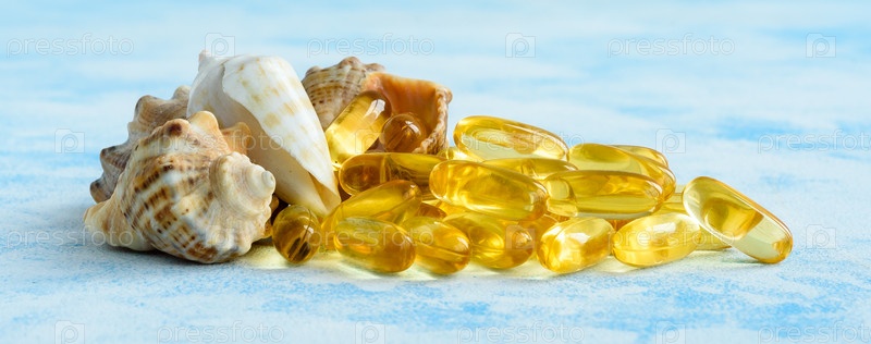 Капсулы с золотым рыбьим жиром на синем фоне - концепция здоровья и натуральных морских витаминов