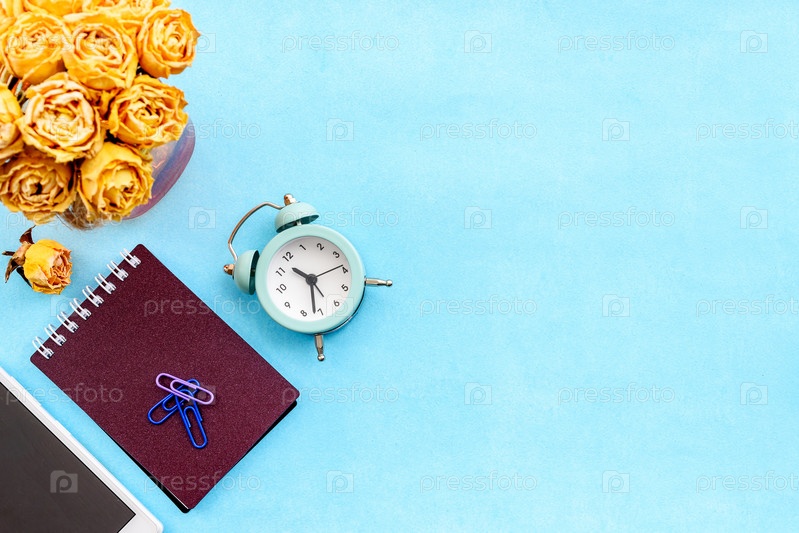 Макет канцелярских товаров на синем фоне. Будильник, белые открытки, цветы и смартфон