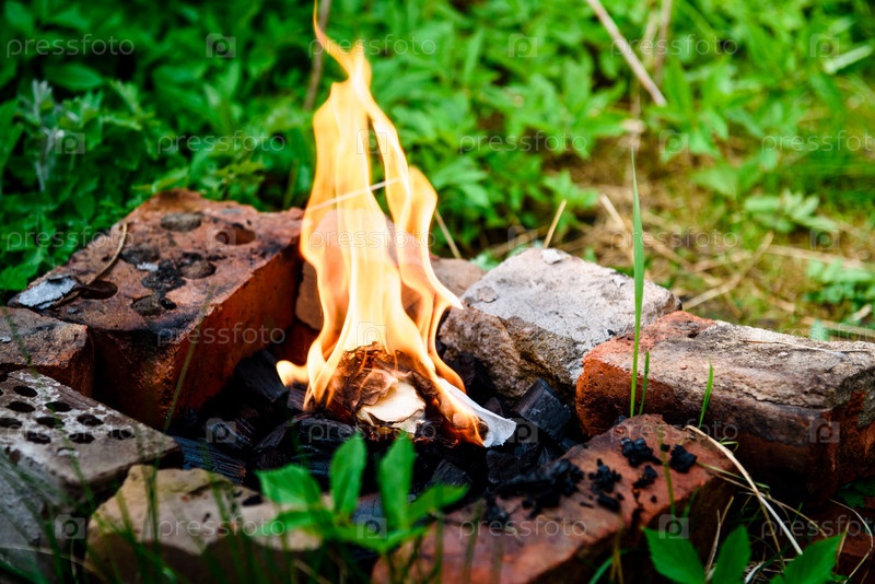 Костер, сложенный из кирпича, представляет собой самодельный гриль-барбекю. Летний пикник