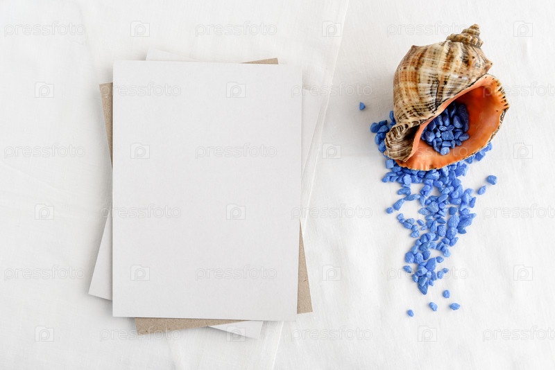 Модный фон канцелярских товаров - белая карта и ракушки на белом столе. Романтический фон. Заготовка для пригласительного билета