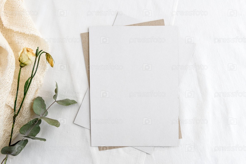 Модный фон канцелярских товаров - белая карточка для письма и веточки сухих растений на белом столе. Свадебный женский фон