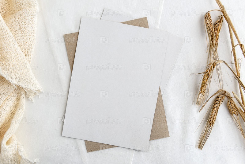 Модный фон канцелярских товаров - белая карта и веточки колосьев пшеницы на белом столе. Романтический фон. Заготовка для пригласительного билета