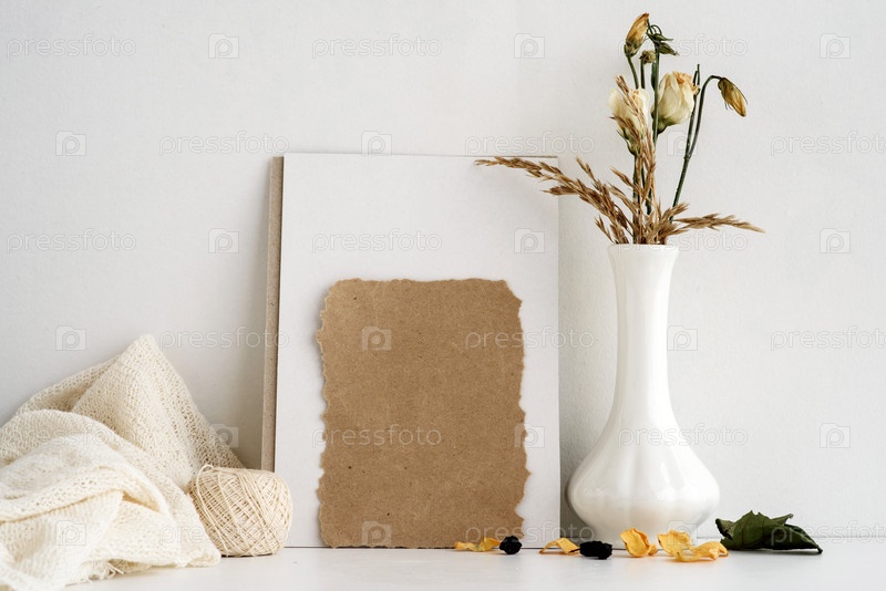 Фон канцелярских товаров моды на белом фоне. пустая открытка с надписью и цветами в белой вазе. Свадебный винтажный фон. Пригласительная открытка