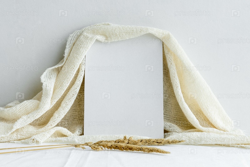 Пустая белая открытка и веточки сухой травы на белом фоне. Свадебный романтический фон для приглашения