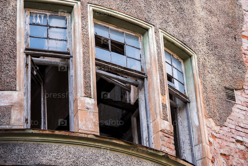 Руины старого дома в винтажном стиле-окна и каменная стена с узором