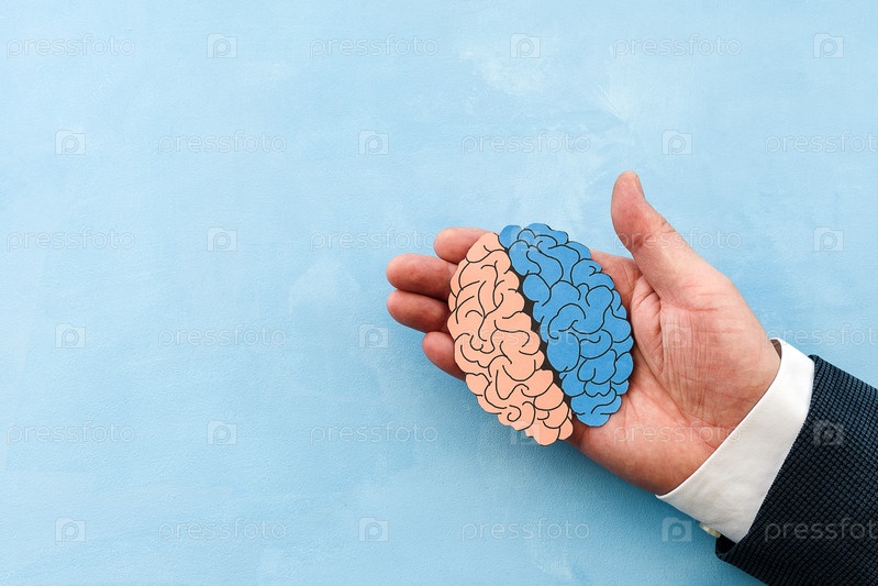Мужские руки держат форму человеческого мозга из бумаги на голубом фоне. Оба полушария окрашены в разные цвета. Концепция умственного развития, идей, прорыва