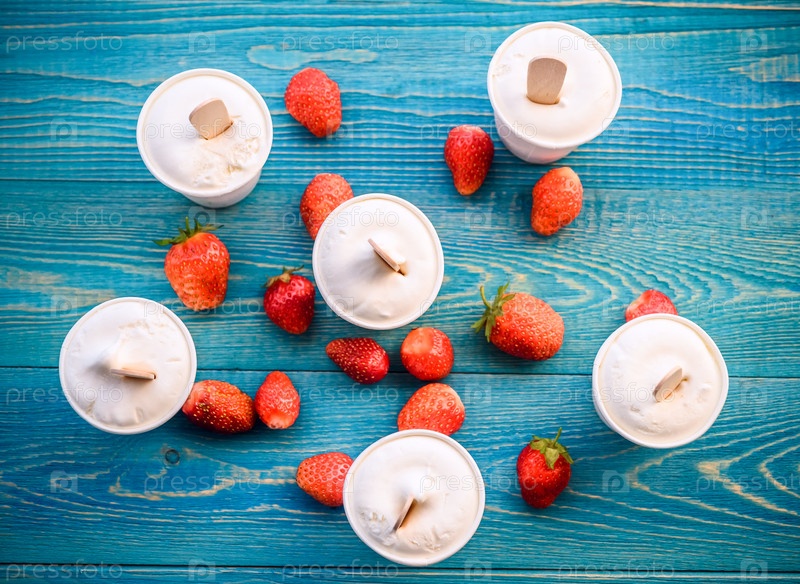 Мороженое в чашках с клубникой на синем деревянном фоне