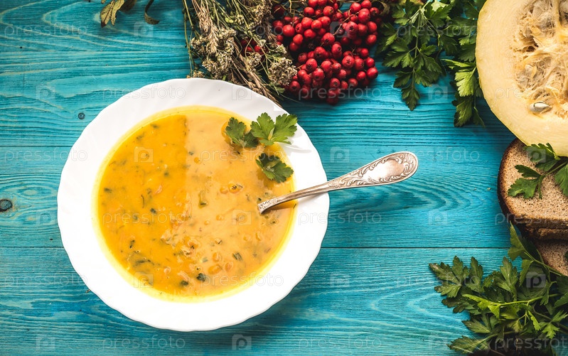Тыквенный суп на деревянном синем фоне. Осенняя еда
