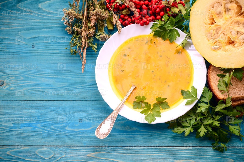 Тыквенный суп на деревянном синем фоне. Осенняя еда