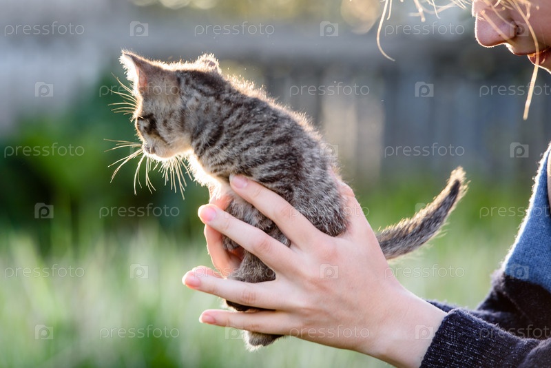 Маленький очаровательный котенок в руках девочки на фоне зеленой лужайки