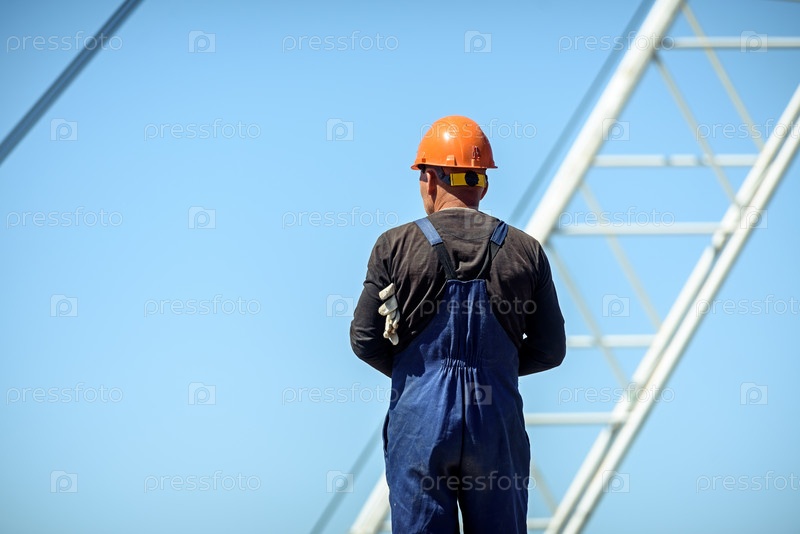 Дорожный рабочий в каске и комбинезоне. Строительство дорог и мостов в городе