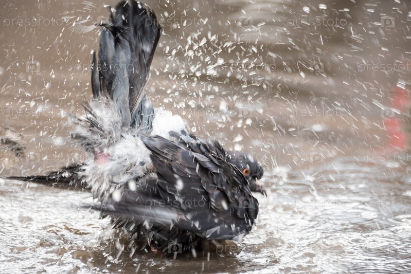 Голубь купается в луже, брызгается
