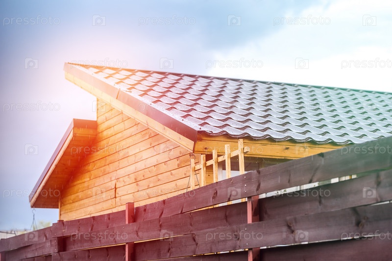 Черепичная крыша деревенского дома освещена солнцем после дождя