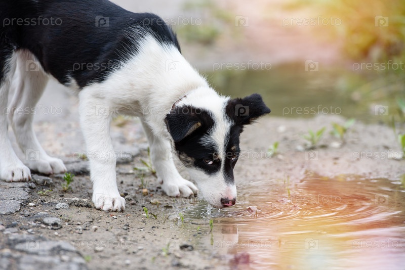 Счастливый молодой щенок пьет из лужи летом, Санни да